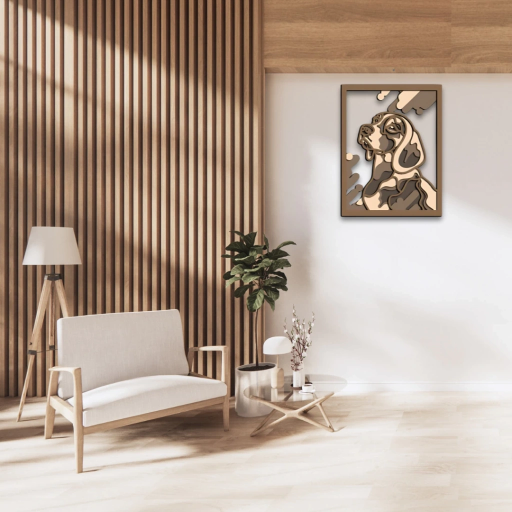 Modern çerçeve tasarımı ve katmanlı yapısıyla öne çıkan bu köpek figürlü ahşap duvar tablosu, sadakati ve zarafeti bir arada sunuyor. Detaylı lazer kesimiyle oluşturulan katmanlar, ürünün hem sanatsal hem de dekoratif değerini artırırken yaşam alanlarınıza sofistike bir görünüm kazandırıyor. Öne Çıkan Özellikler: