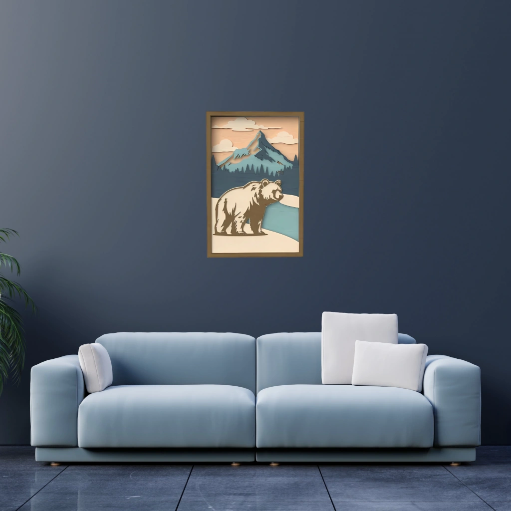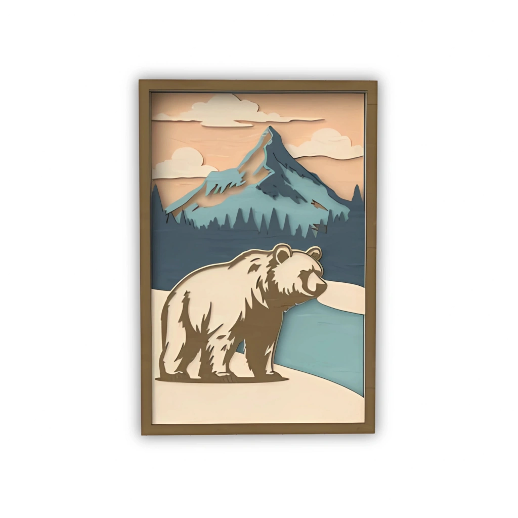 Dağ Manzaralı Ayı Figürlü Ahşap Duvar Tablosu