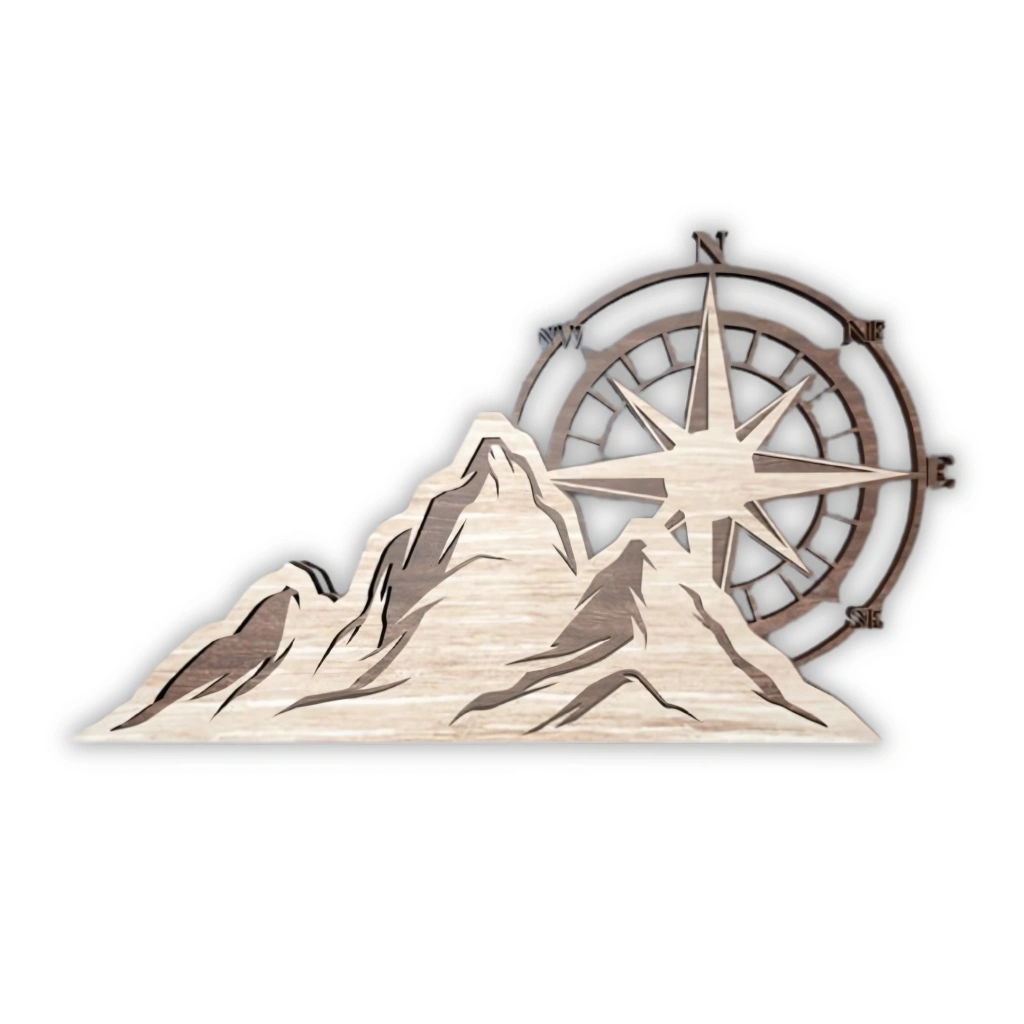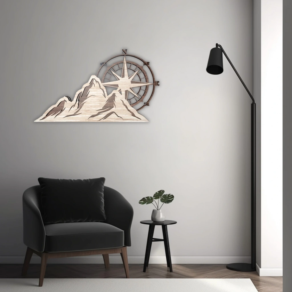 Dağ ve Pusula Temalı Katmanlı Ahşap Duvar Dekoru Doğayla iç içe olmayı sevenler için tasarlanan bu dağ ve pusula temalı ahşap duvar dekoru, keşfetme ruhunu ve özgürlüğü simgeliyor. Minimalist detaylara sahip bu tasarım, yaşam alanlarına doğadan ilham alan sofistike bir dokunuş katıyor. Öne Çıkan Özellikler:
