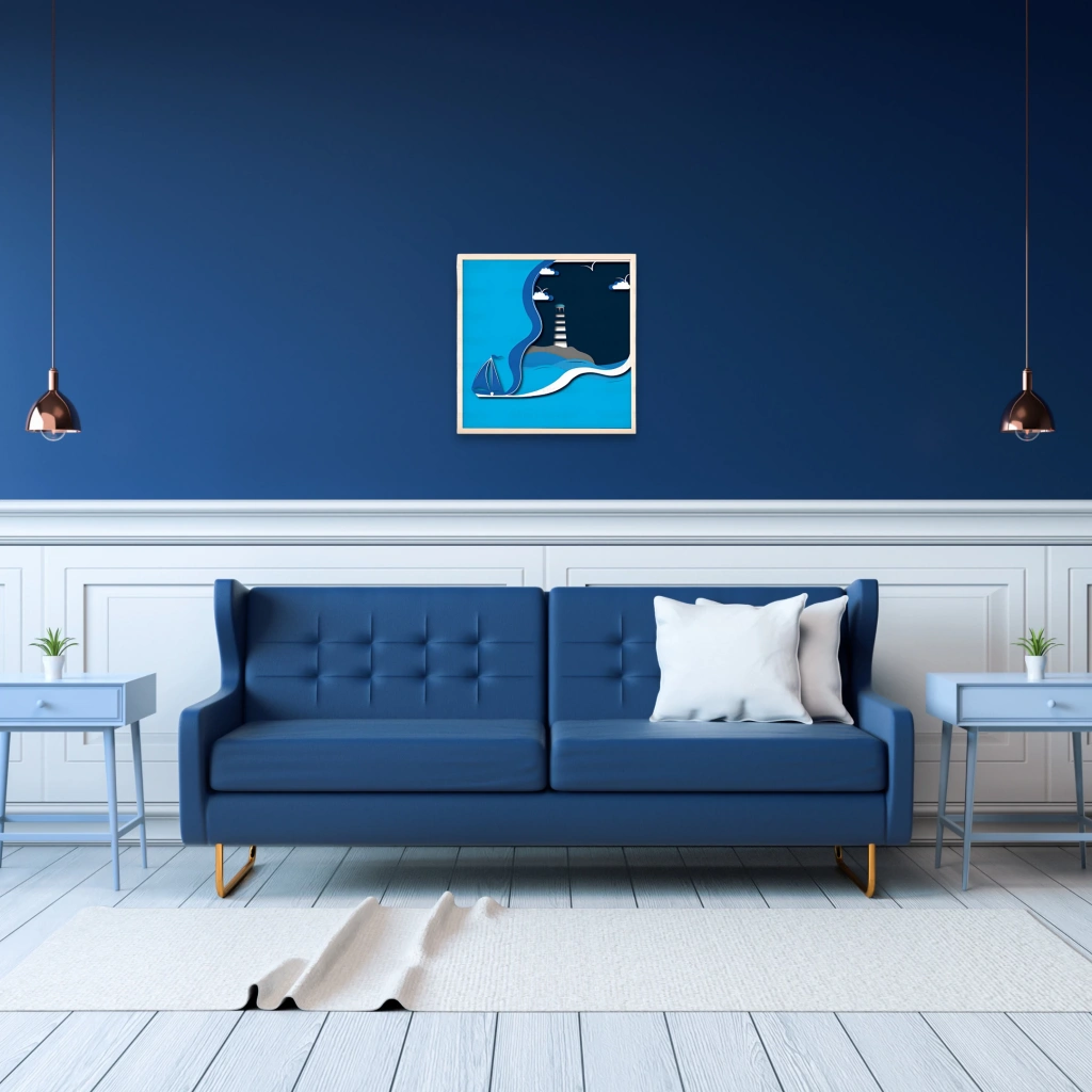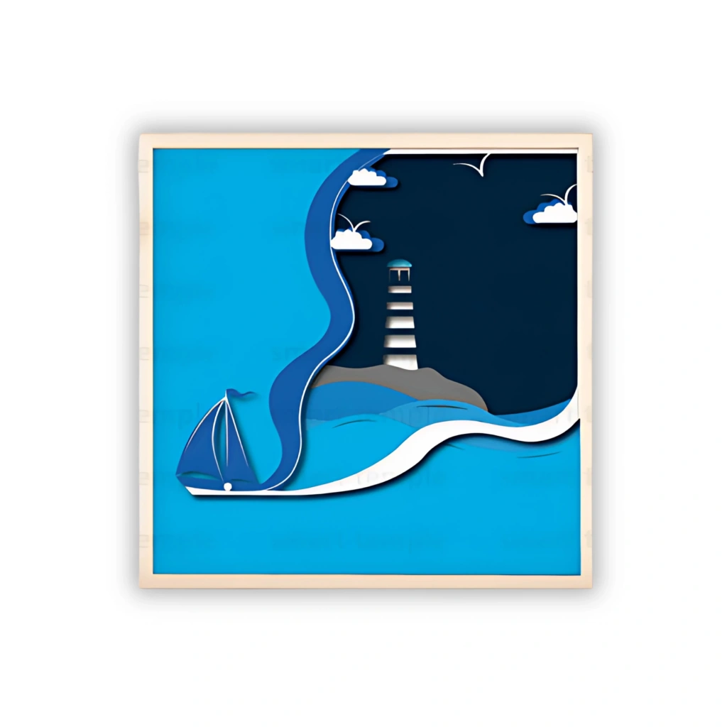 Deniz Feneri ve Yelkenli Temalı Katmanlı Ahşap Duvar Dekoru Deniz tutkunları için özel olarak tasarlanmış bu duvar dekoru, sakin maviler ve zarif dalga geçişleriyle yaşam alanlarınıza huzurlu bir atmosfer katıyor. Yelkenli ve deniz feneri detaylarıyla deniz manzarasını duvarlarınıza taşıyan bu tasarım, marin temalı dekorasyonları tamamlamak için harika bir tercih. Öne Çıkan Özellikler: