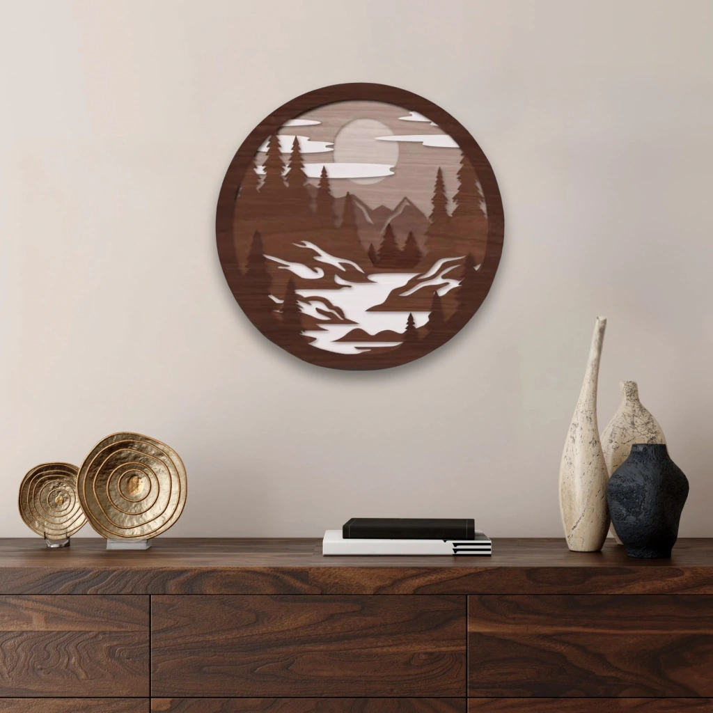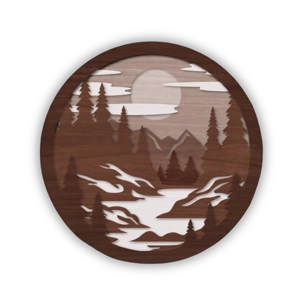Doğa Manzaralı Katmanlı Ahşap Duvar Dekoru Doğanın dinginliğini ve huzurunu yansıtan bu eşsiz tasarım, dağlar, ormanlar ve bir göl manzarasını katmanlı yapısıyla adeta üç boyutlu bir tabloya dönüştürüyor. Minimal ve doğal tonlarla işlenmiş bu duvar dekoru, sade ama etkileyici bir estetik sunar. Öne Çıkan Özellikler: