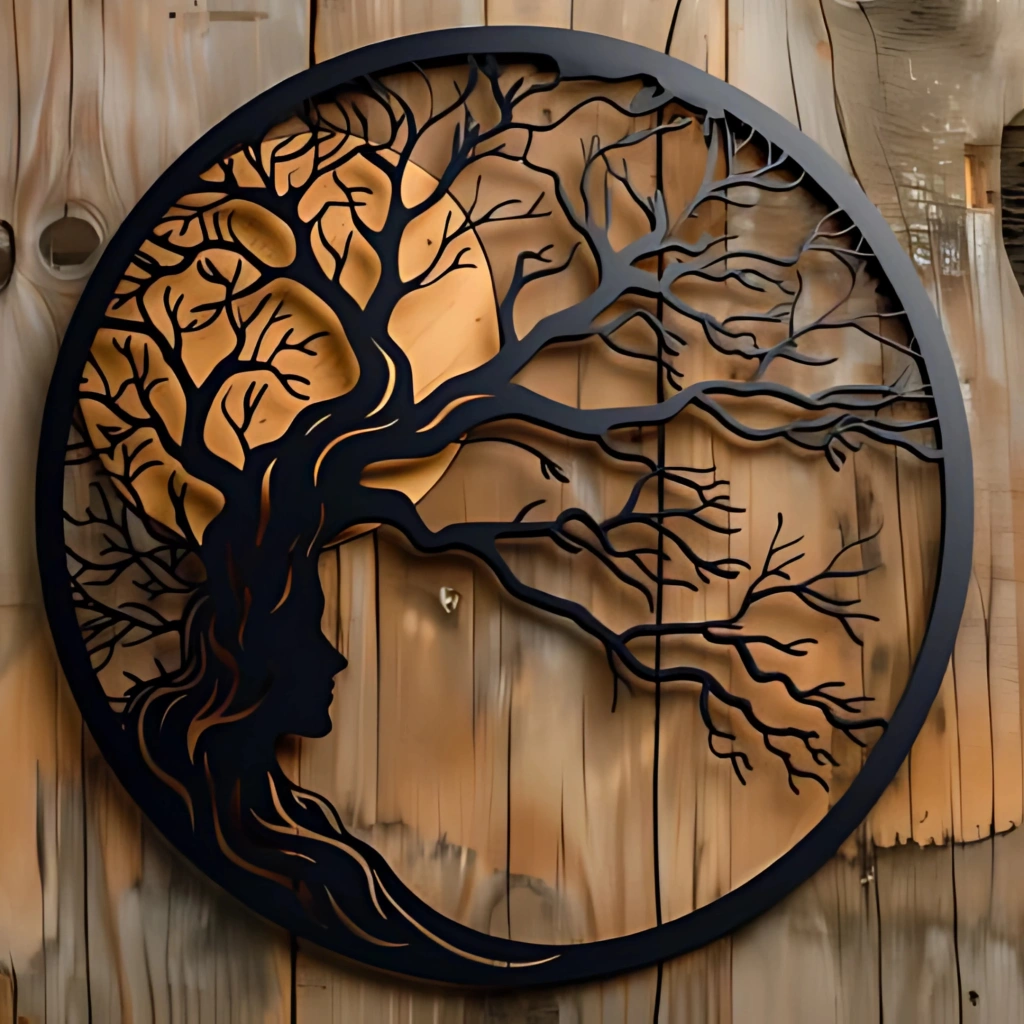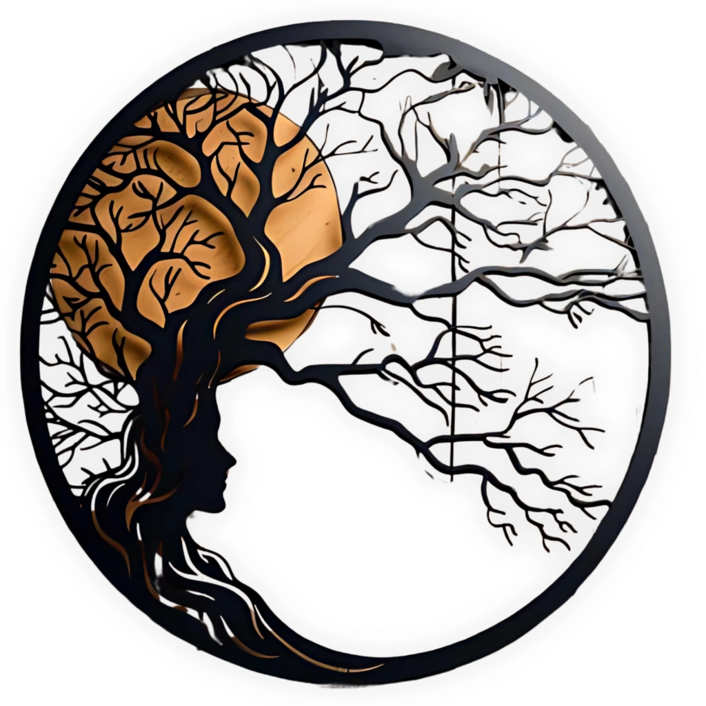 Doğa ve Kadın Silüeti Temalı Katmanlı Ahşap Duvar Dekoru Doğanın zarafeti ile kadının gücünü bir araya getiren bu özel tasarım, duvarlarınızda şiirsel bir ifade oluşturur. Ağaç dallarına dönüşen saçlar ve ay siluetiyle birleşen kompozisyon, hem sanatsal hem de ruhsal bir atmosfer yaratır. Öne Çıkan Özellikler: