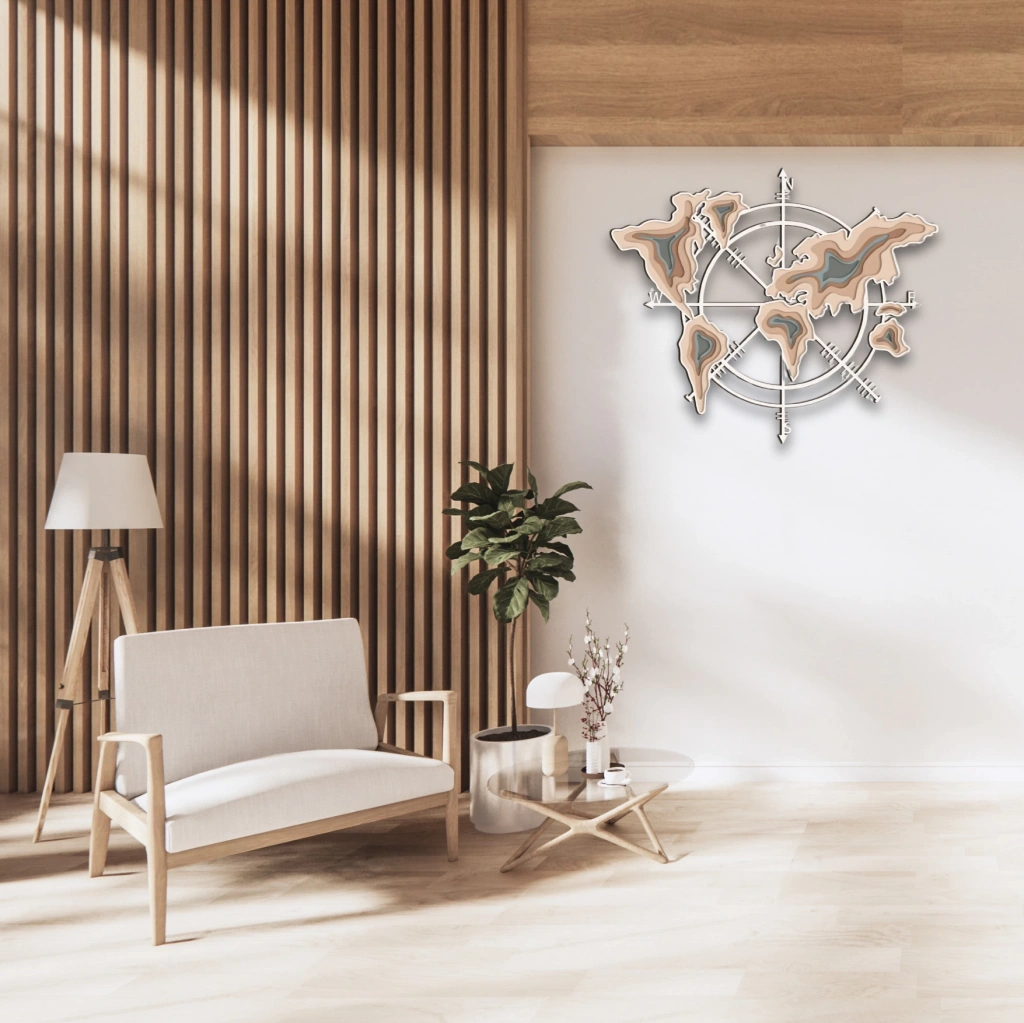 Dünya Haritası Temalı Katmanlı Ahşap Duvar Dekoru Katmanlı ahşap tasarımıyla öne çıkan bu özel duvar dekoru, dünya haritası figürüyle hem estetik hem de anlam yüklü bir parça sunuyor. Yönleri gösteren pusula detaylarıyla birlikte tasarlanan bu ürün, keşfetmeyi sevenler için ideal bir dekoratif objedir. Modern ve rustik dekorasyon tarzlarıyla mükemmel uyum sağlayan bu duvar süsü, yaşam alanlarınıza sofistike bir hava katar. Öne Çıkan Özellikler: