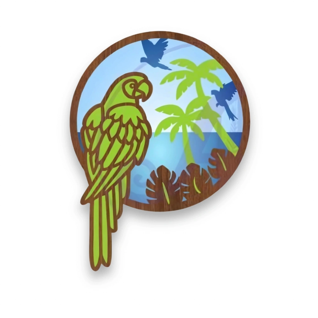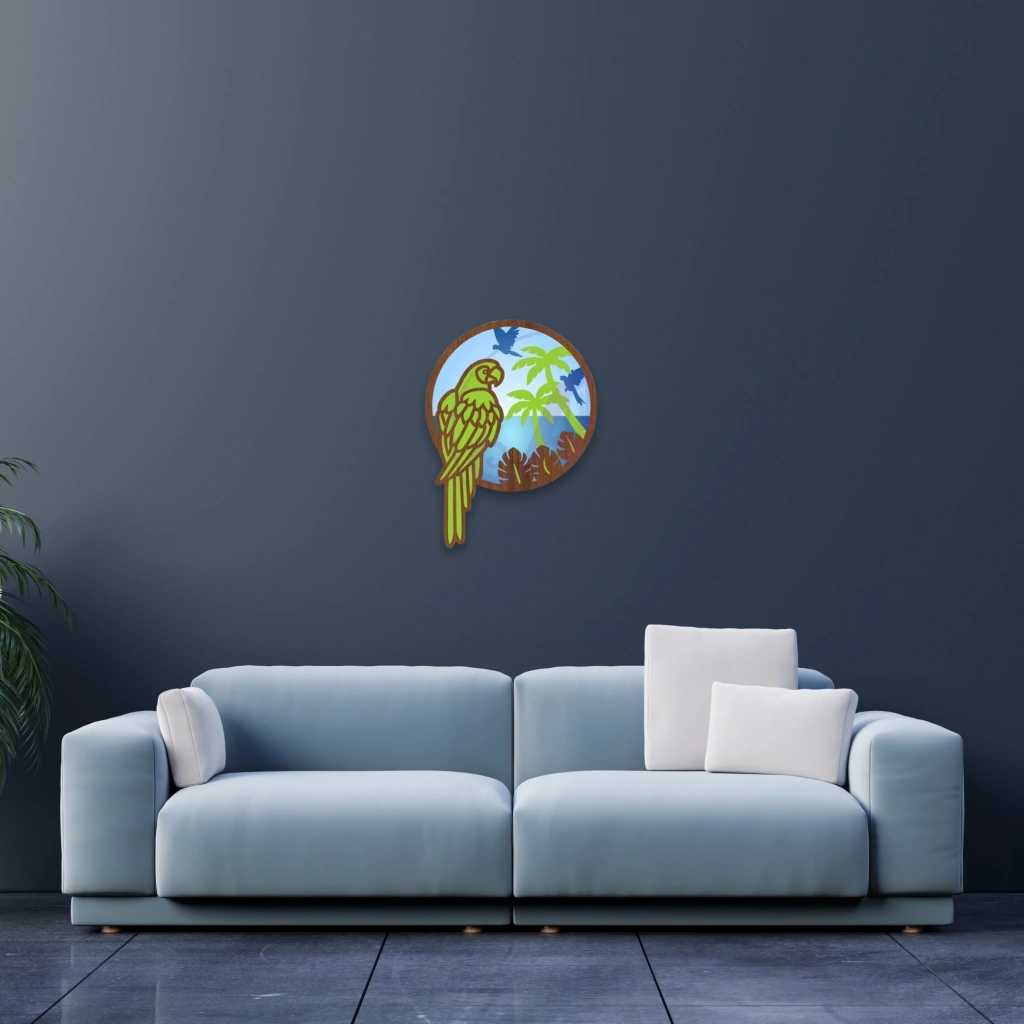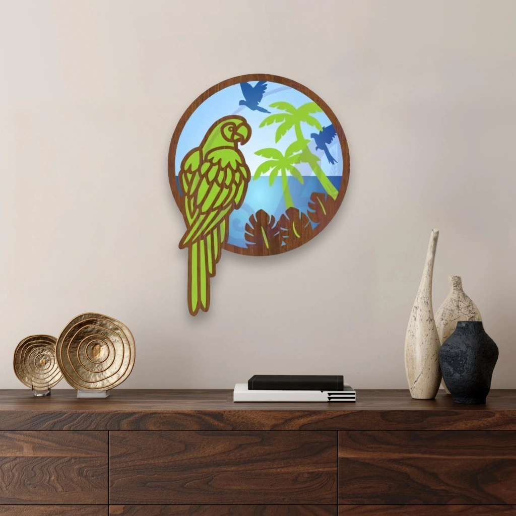 Egzotik Papağan Temalı Katmanlı Ahşap Duvar Dekoru Canlı renkleri ve tropikal atmosferiyle dikkat çeken bu duvar dekoru, doğaseverler için eğlenceli ve enerjik bir seçenek sunar. Egzotik papağan figürü ve arka plandaki palmiye detayları ile tropik bir kaçış hissi yaşatır. Öne Çıkan Özellikler: