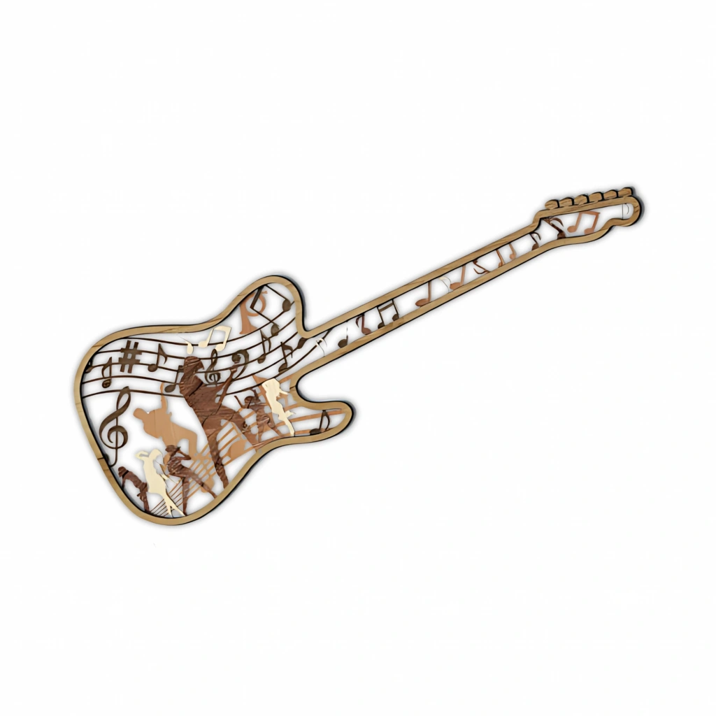Gitar Silueti ve Notalar Temalı Çok Katmanlı Ahşap Duvar Dekoru Müziğin büyüleyici gücünü yansıtan bu özel tasarım, gitar formu ve içerisinde yer alan notalar ile sahne ruhunu evinize taşıyor. 10 katmandan oluşan bu dekor, üç boyutlu derinliği ve zarif işçiliğiyle fark yaratır. Öne Çıkan Özellikler: