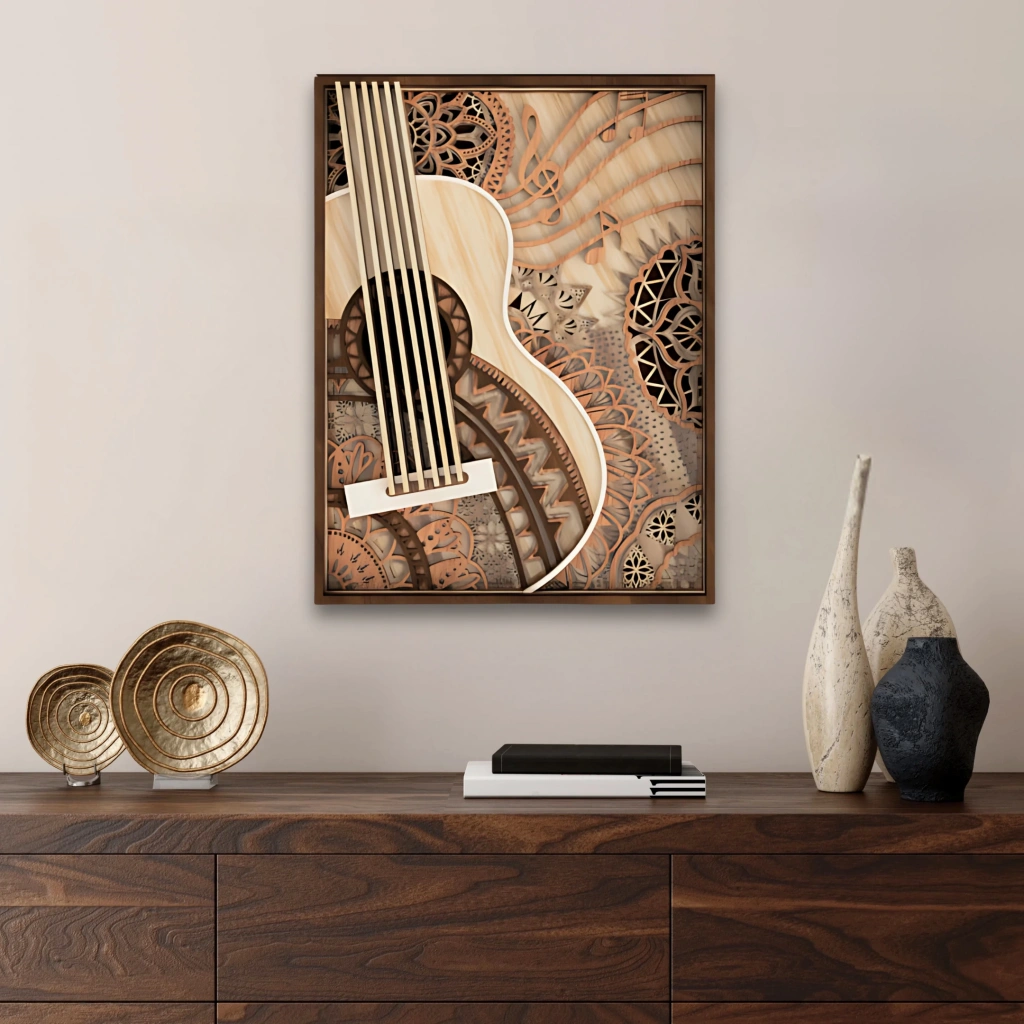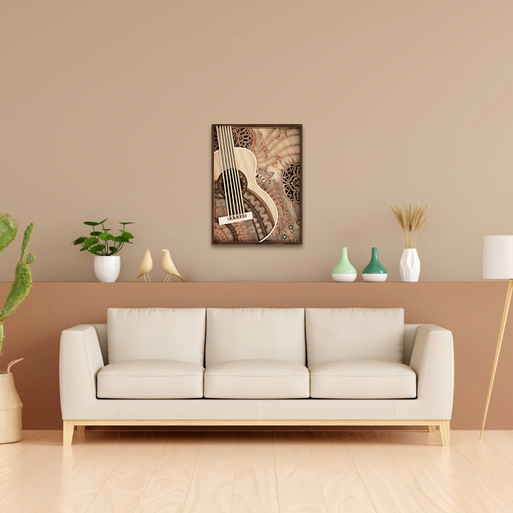 Gitar Temalı Katmanlı Ahşap Duvar Dekoru Klasik gitarın zarif kıvrımları ve müziğin ritmini yansıtan dantel benzeri desenlerle işlenmiş bu katmanlı ahşap duvar dekoru, hem müzik tutkunlarına hem de sanatsal detaylardan hoşlananlara hitap ediyor. Gitarın tınısını adeta hissettiren bu tasarım, bulunduğu alana sanatsal bir ruh katıyor. Öne Çıkan Özellikler: