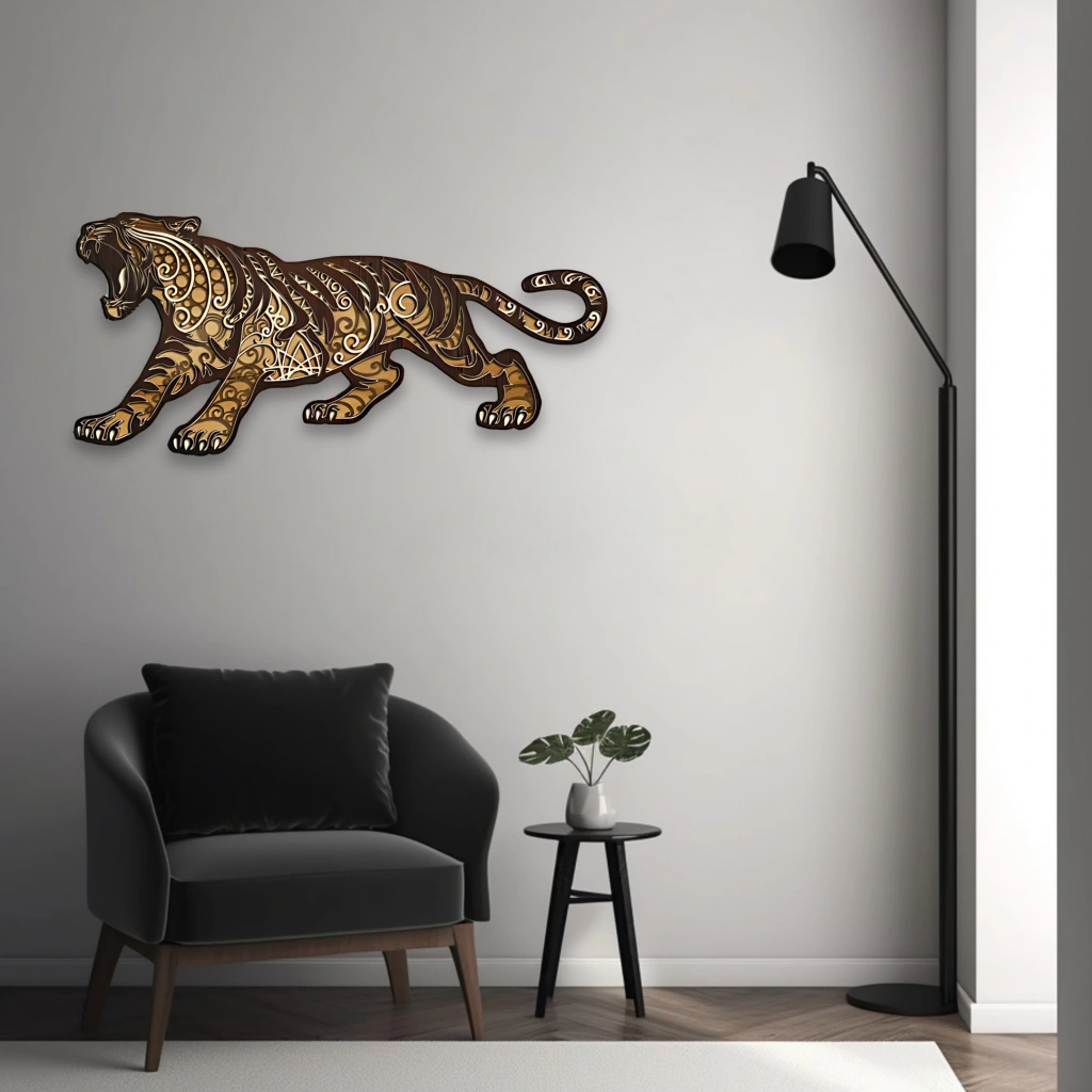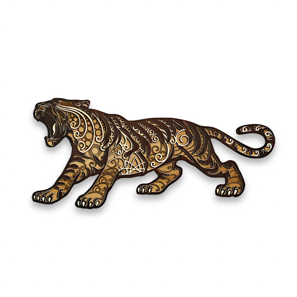 Kaplan Figürlü Katmanlı Ahşap Duvar Dekoru Gücü, cesareti ve asaleti simgeleyen kaplan figürü, detaylı oyma desenlerle birleşerek bu özel duvar dekoruna hayat veriyor. İç mekânlara karakter ve dinamizm katmak isteyenler için güçlü bir ifade sunar. Öne Çıkan Özellikler: