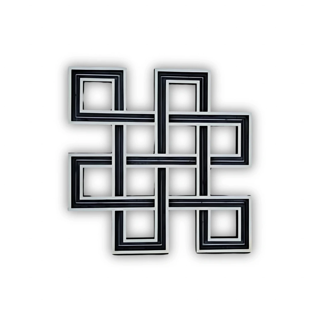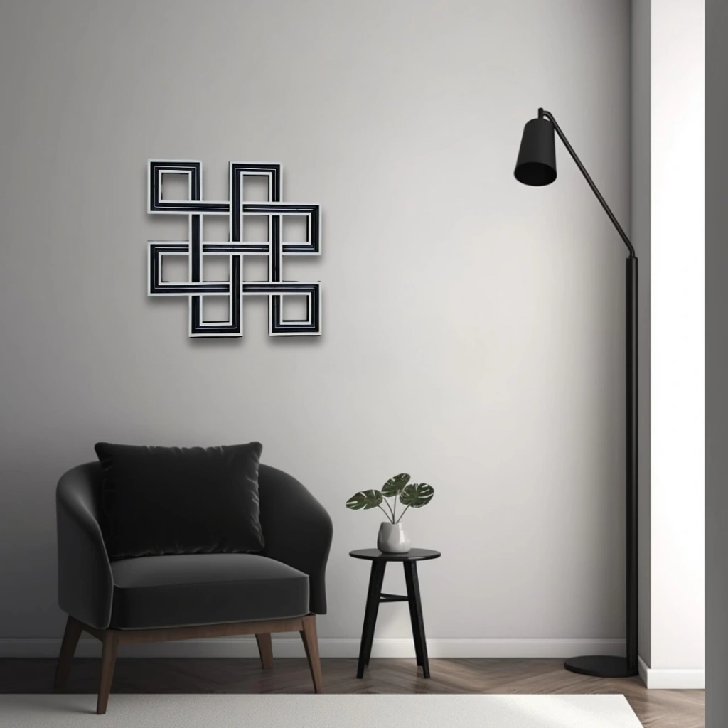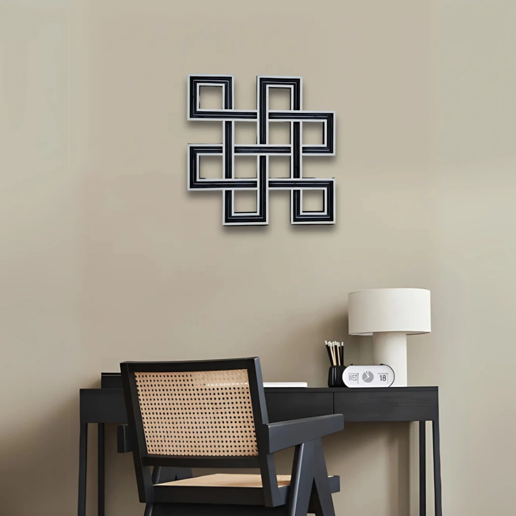 Geometrik Düğümlü Tasarım Modern çizgilerle hazırlanmış bu özgün tasarım, birbirine geçmiş geometrik formlarıyla dikkat çeker. Dairesel yumuşak geçişlerin aksine, bu dekoratif parça daha köşeli ve güçlü bir estetik sunar. Sonsuzluk temasını çağrıştıran bu desen, kelt düğümü formundan esinlenerek tasarlanmıştır. Öne Çıkan Özellikler: