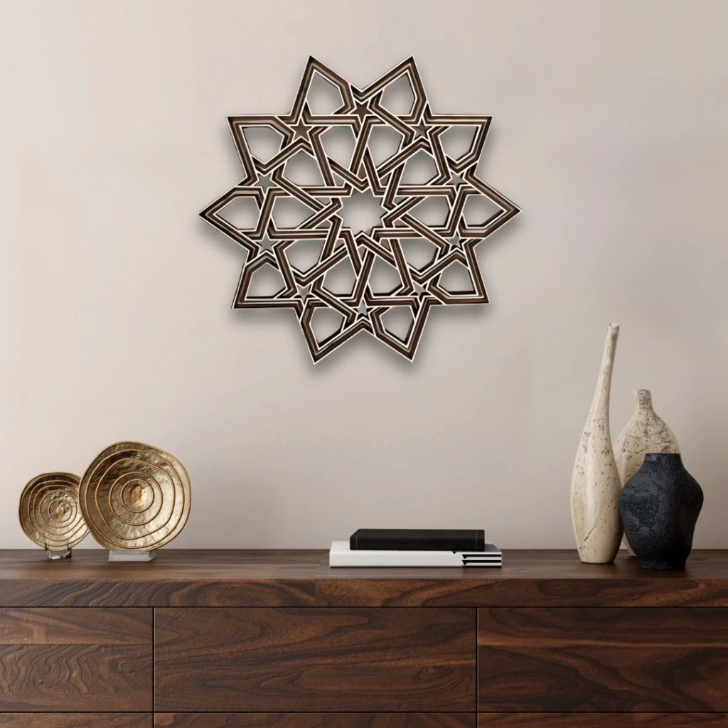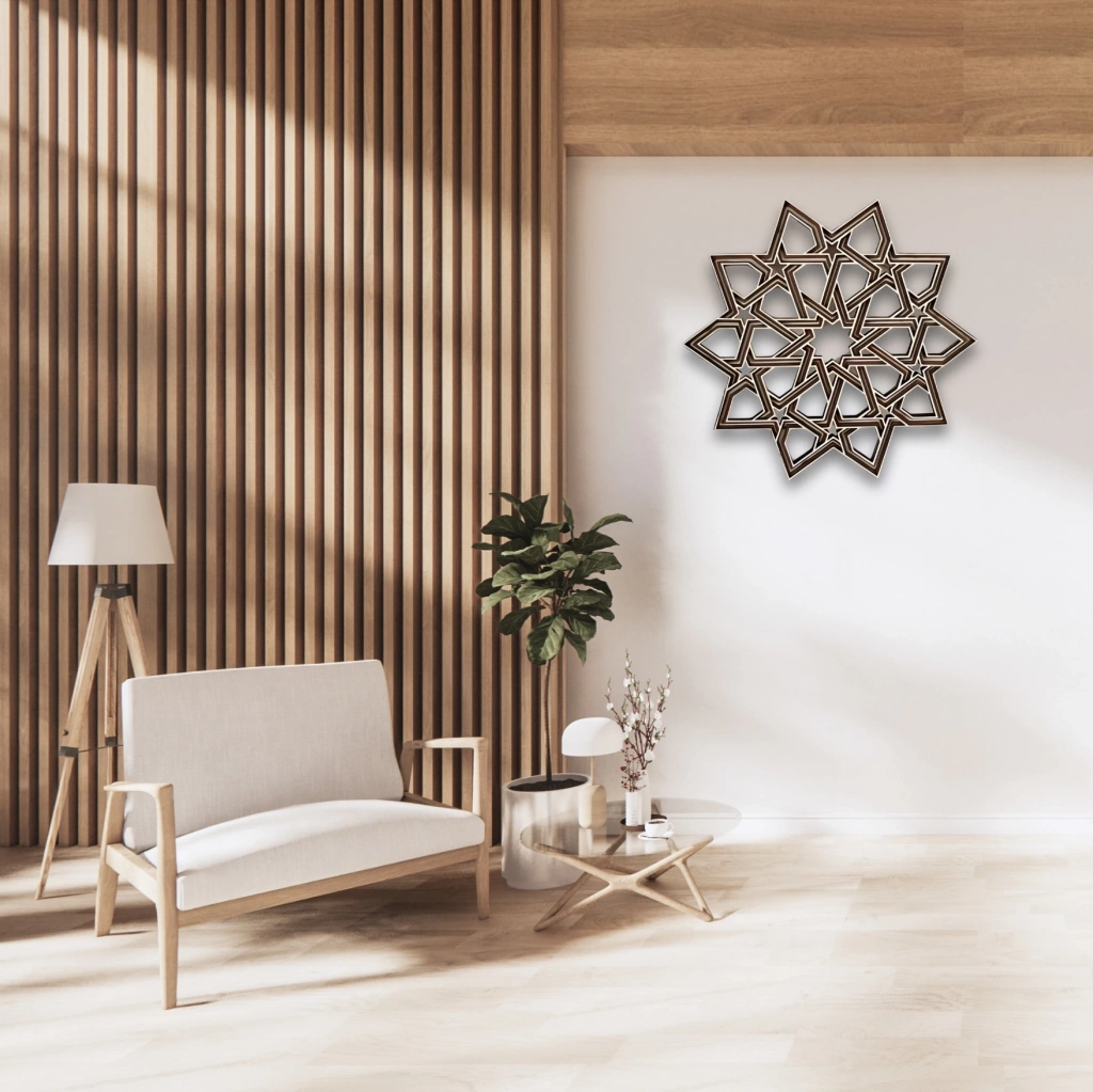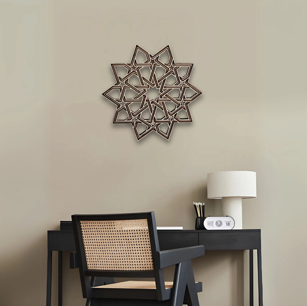 Geometrik Yıldız Deseni İç içe geçmiş yıldız formundan oluşan bu zarif ahşap duvar dekoru, mekanınıza estetik bir denge ve görsel bir zenginlik katar. Geleneksel motiflerden esinlenen tasarımı modern bir çizgiyle yeniden yorumlanmıştır. Simetrik yapısı sayesinde farklı dekorasyon stilleriyle kolaylıkla uyum sağlar. Öne Çıkan Özellikler: