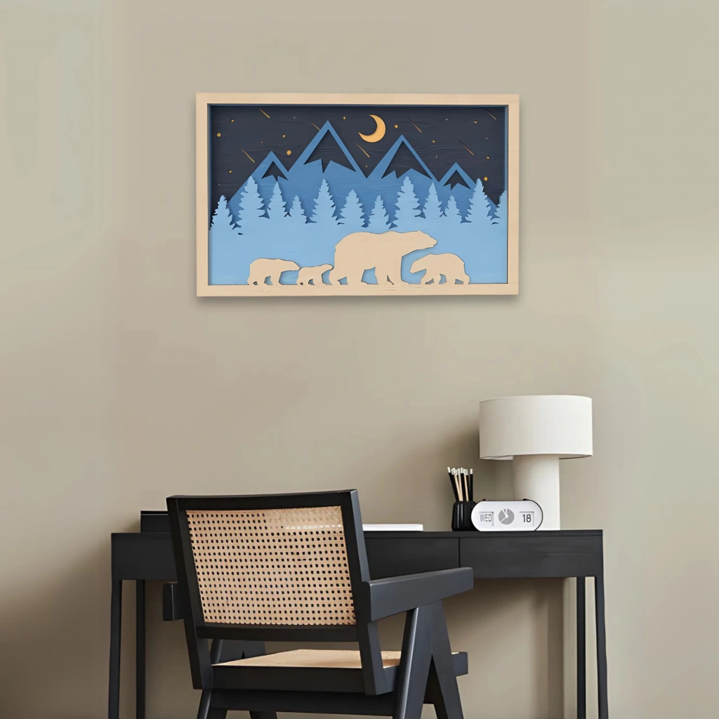 Kutup Ayısı Ailesi Temalı Katmanlı Ahşap Duvar Dekoru Gece göğü altında yol alan bir kutup ayısı ailesinin huzur dolu siluetiyle tasarlanan bu özel dekor, doğanın dinginliğini yaşam alanlarınıza taşıyor. Dağlar, ormanlar ve yıldızlarla çevrili bu sahne, sıcak ve samimi bir atmosfer yaratıyor. Öne Çıkan Özellikler: