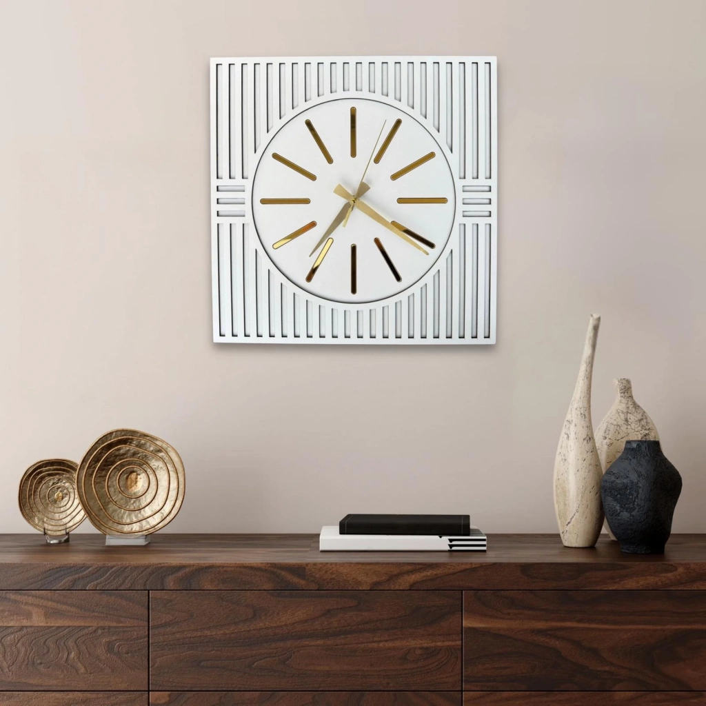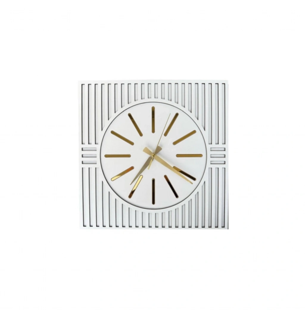 Zamansız çizgileri ve şık formuyla öne çıkan bu modern kare duvar saati, evinizin dekorasyonuna zarif bir dokunuş katıyor. Beyaz zemin üzerine lazer kesim çizgiler ve iç kısmındaki altın tonlu detaylar, minimal şıklığı sevenler için ideal bir kombinasyon sunar. Oturma odası, antre ya da ofis gibi pek çok alanda kolaylıkla kullanılabilir.