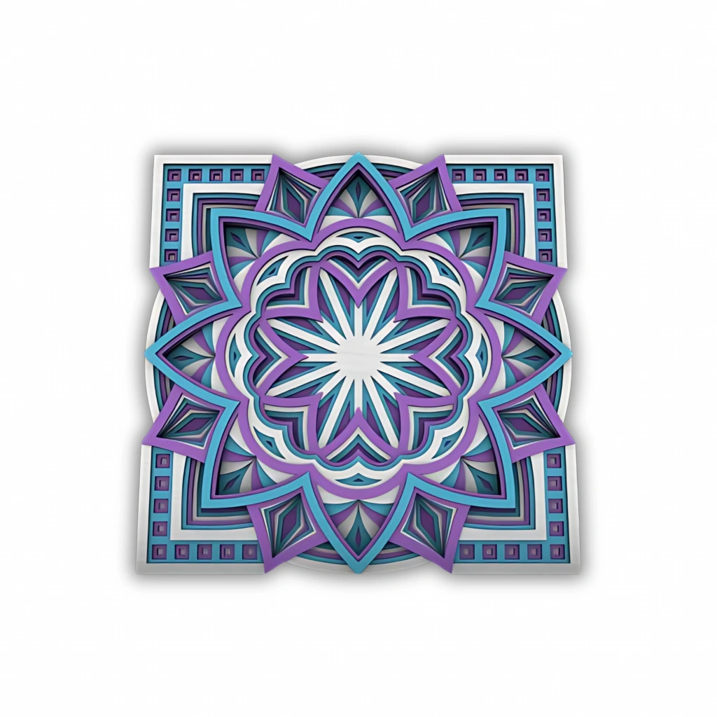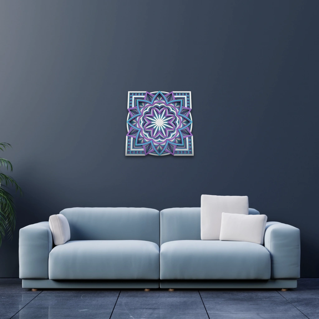 Mor ve Mavi Tonlarda Mandala Desenli Çok Katmanlı Ahşap Duvar Dekoru Mandala sanatının simetrik güzelliğini modern renklerle buluşturan bu özel tasarım, yaşam alanlarınıza hem estetik hem de spiritüel bir dokunuş katıyor. Mor ve mavi tonların iç içe geçtiği bu desen, odaklanma ve huzur hissi yaratmak isteyenler için ideal. Öne Çıkan Özellikler:
