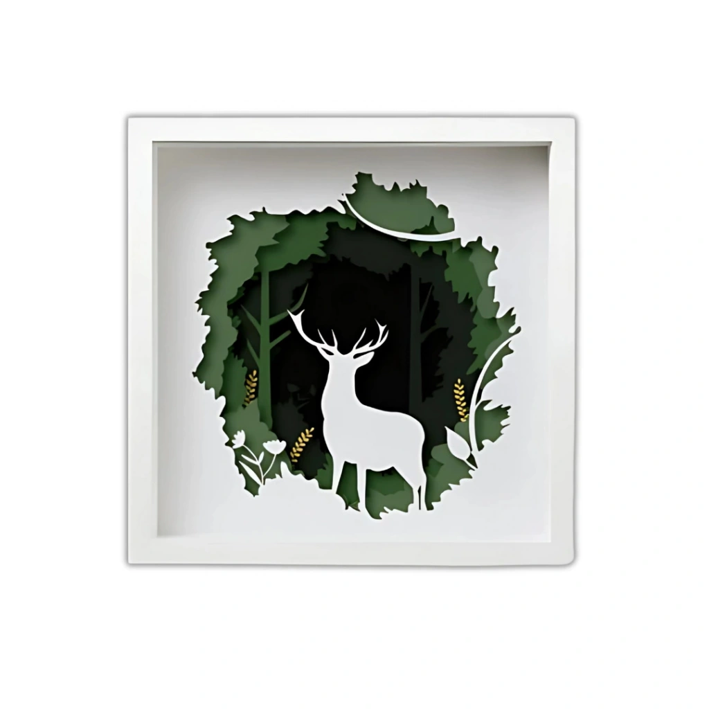 Orman ve Geyik Temalı Çok Katmanlı Ahşap Duvar Dekoru Derin yeşil tonların hâkim olduğu bu orman manzarasında, asil duruşuyla öne çıkan geyik figürü dekoratif bir denge sunar. Doğayı sevenler için özel olarak tasarlanmış bu katmanlı ahşap duvar dekoru, yaşam alanlarınıza huzur dolu bir atmosfer taşır. Öne Çıkan Özellikler: