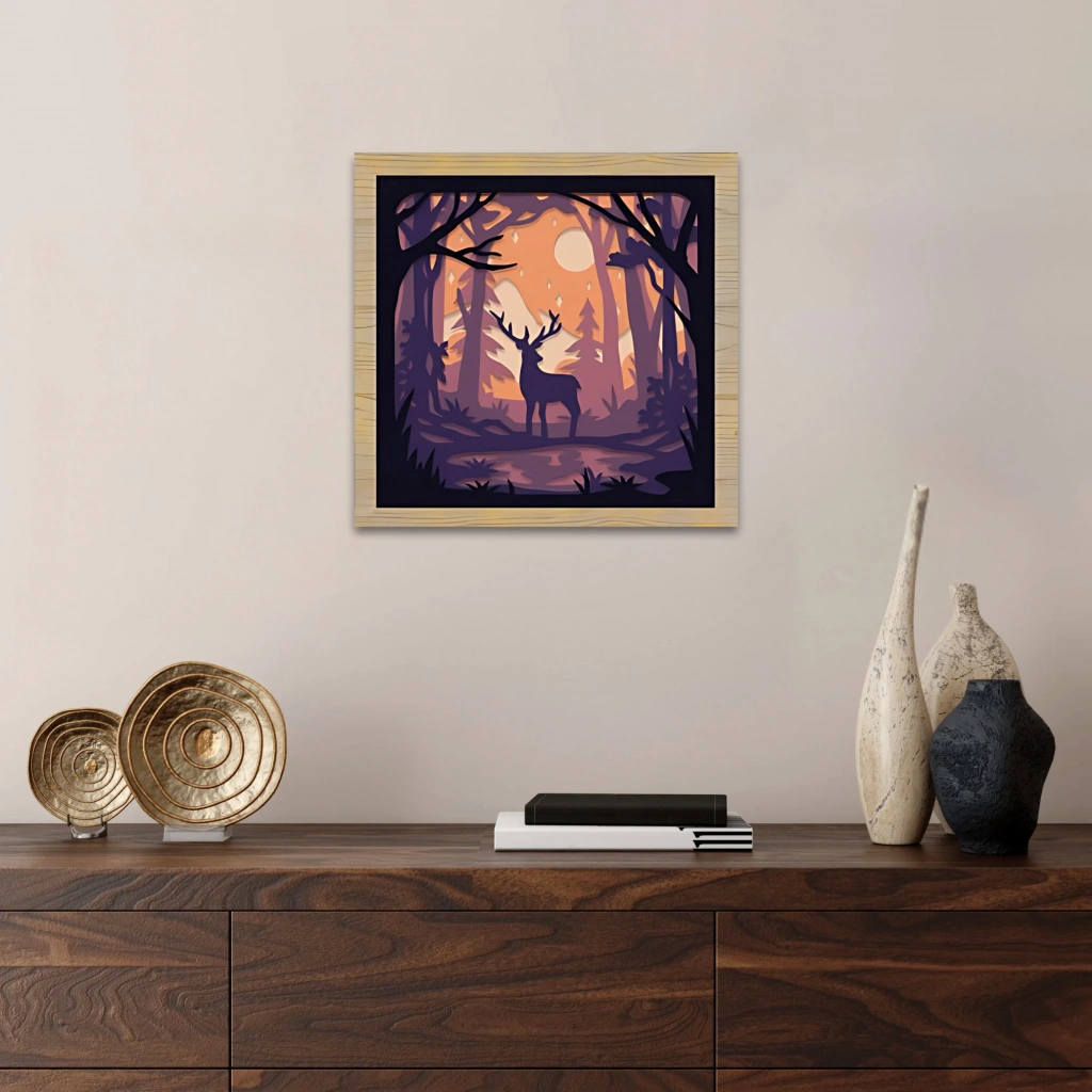 Orman ve Gün Batımı Temalı Çok Katmanlı Ahşap Duvar Dekoru Gün batımının sıcak tonlarıyla bezenmiş bu eşsiz orman sahnesi, gizemli bir atmosferde silueti beliren geyik figürüyle dikkat çeker. Doğayla iç içe bir yaşamı sevenler için ideal olan bu tasarım, duvarlarınıza sanatsal bir derinlik katar. Öne Çıkan Özellikler: