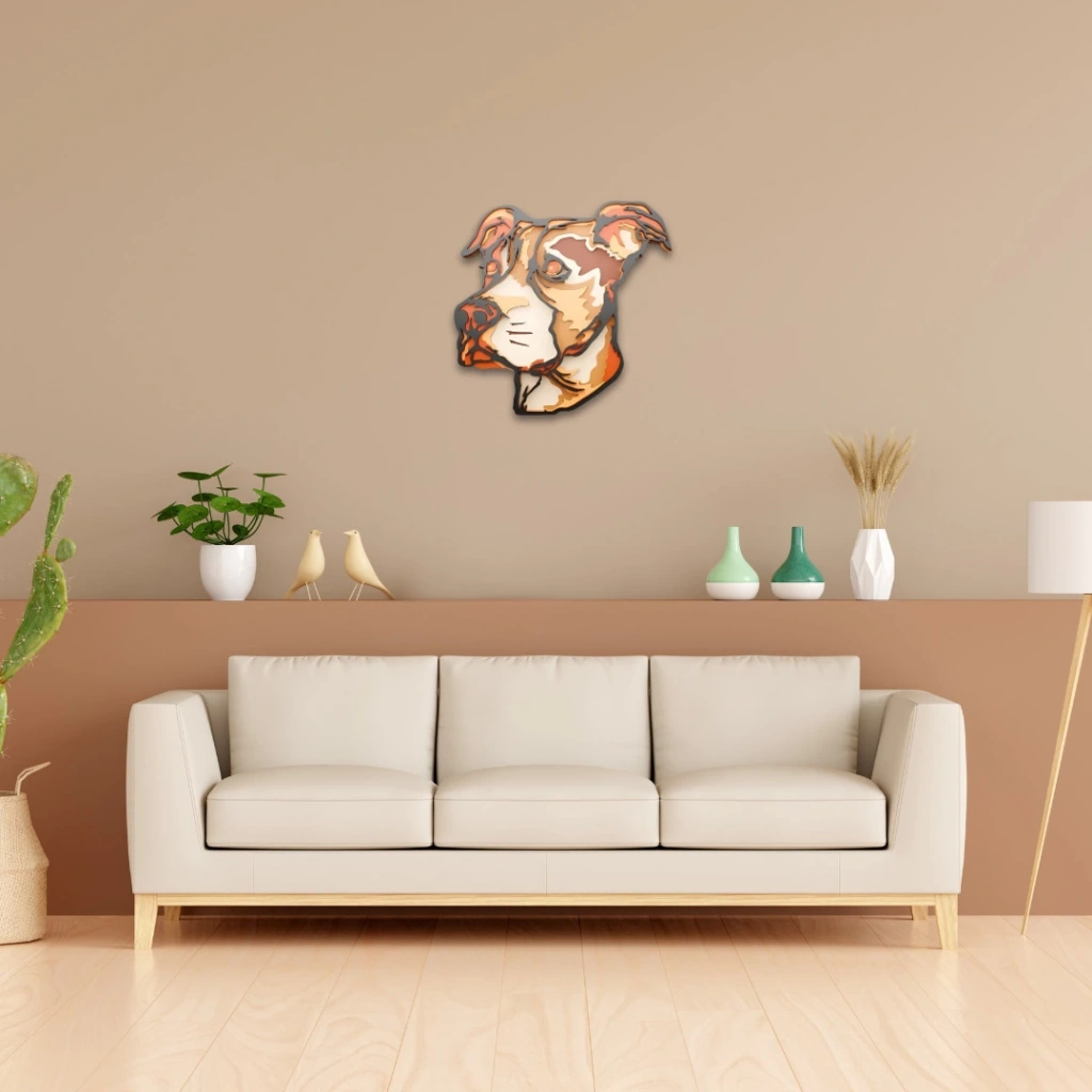 Pitbull Figürlü Çok Katmanlı Ahşap Duvar Dekoru Güçlü duruşu ve sadık bakışlarıyla dikkat çeken bu pitbull figürlü dekor, karakterli tasarımıyla yaşam alanlarına enerjik bir hava katıyor. Modern çizgilerle harmanlanmış canlı renk tonları, duvarlarınıza cesur ve dikkat çekici bir dokunuş sağlar. Öne Çıkan Özellikler:
