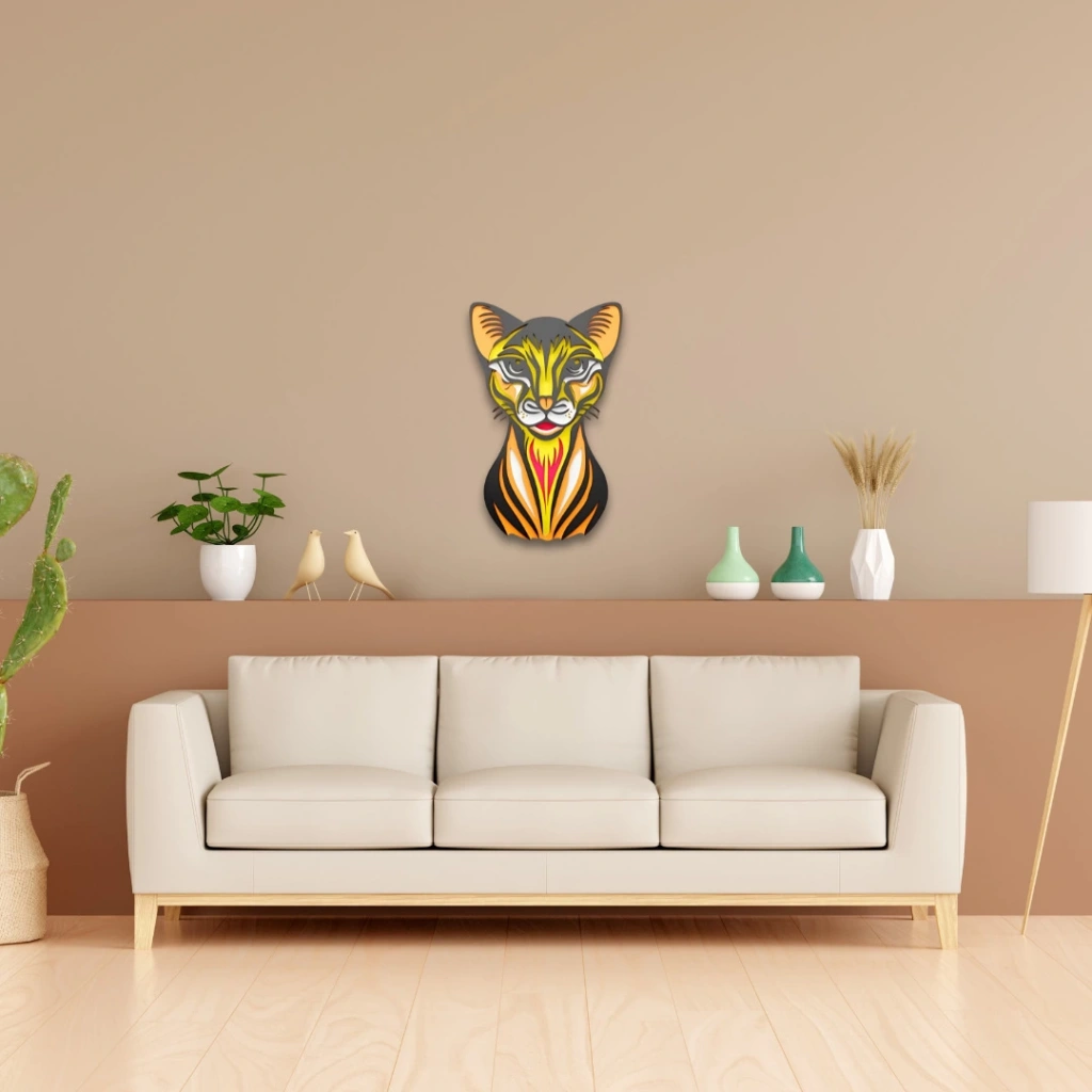 Sanatsal çizgilerle yorumlanmış bu renkli kedi figürü, bulunduğu ortama canlılık ve zarafet katmak için özel olarak tasarlandı. Canlı sarı, turuncu ve siyah tonlarının uyumuyla dikkat çeken bu dekoratif parça, evinizin veya ofisinizin duvarında modern bir odak noktası oluşturur.
