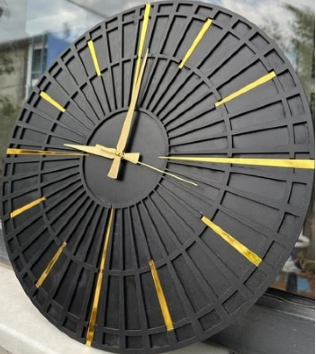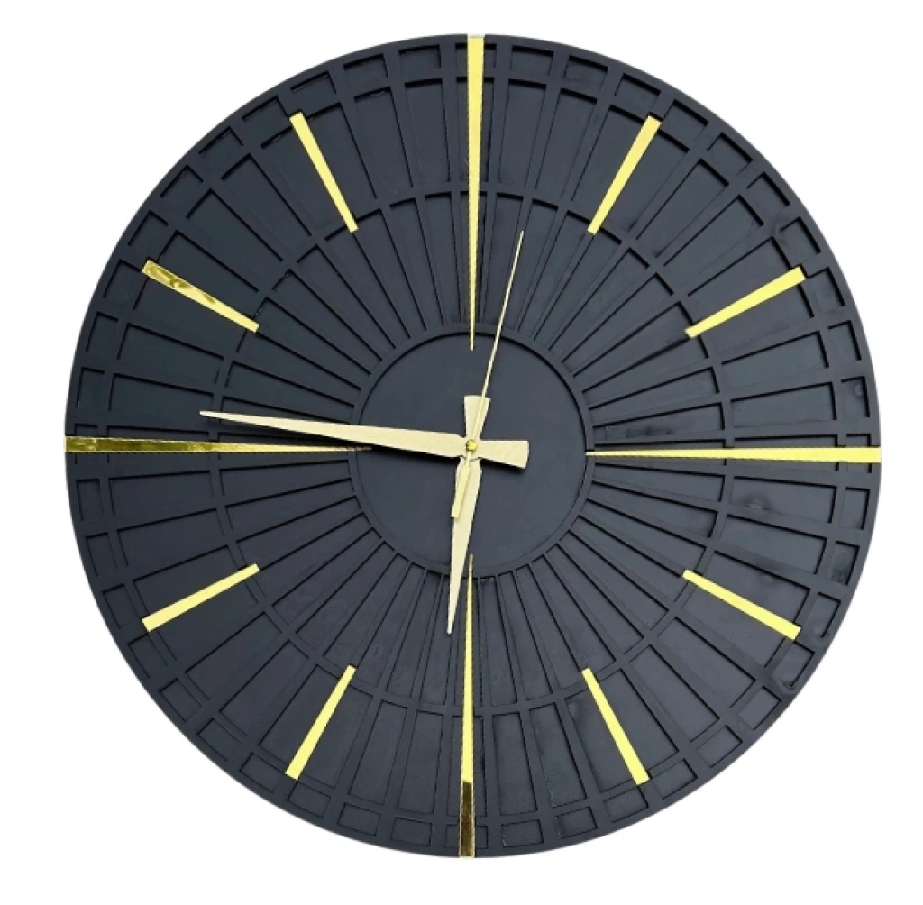 Sade çizgilerin cesur bir duruşla buluştuğu bu siyah duvar saati, altın detaylı zarif dokunuşlarıyla yaşam alanlarınıza güçlü bir şıklık katıyor. Dairesel form üzerine işlenmiş geometrik desenler ve parlak altın saat göstergeleri, hem klasik hem modern dekorasyon tarzlarına uyum sağlar. Göz alıcı ve sofistike bir parça arayanlar için ideal!