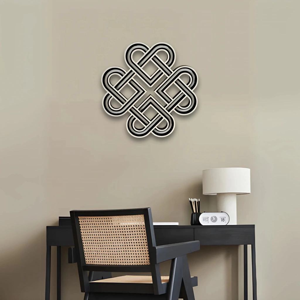 Zamansız ve Estetik Bir Dokunuş Sonsuzluk, birlik ve uyumu simgeleyen bu özel tasarım ahşap duvar dekoru; geometrik desenleri sevenler için ideal, şık bir tamamlayıcıdır. Tasarımda yer alan iç içe geçmiş çizgiler, Kelt düğümünden ilham alarak oluşturulmuştur ve bulunduğu ortama anlam katar. Siyah-beyaz kontrastıyla hem geleneksel hem modern mekânlara uyum sağlar. Öne Çıkan Özellikler: