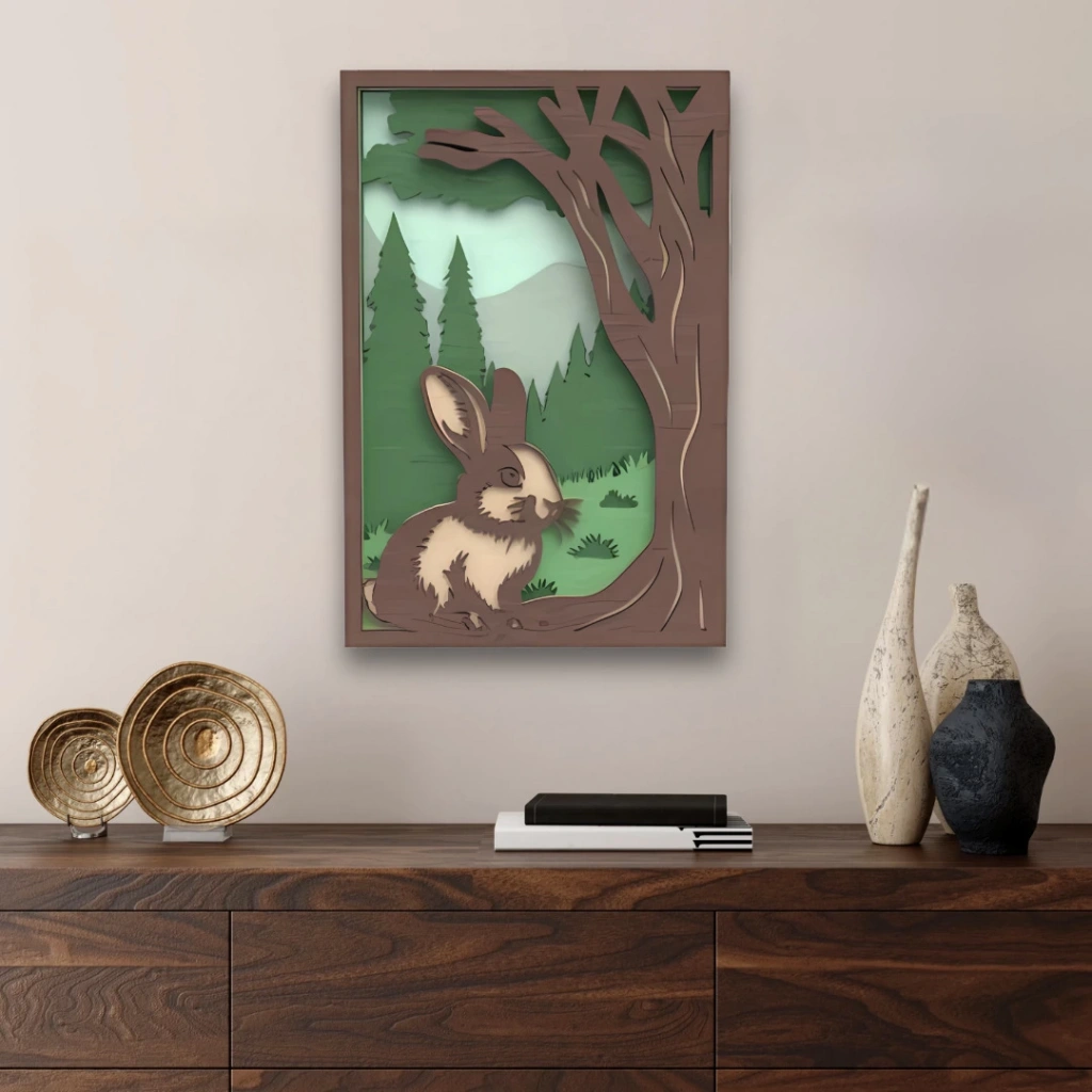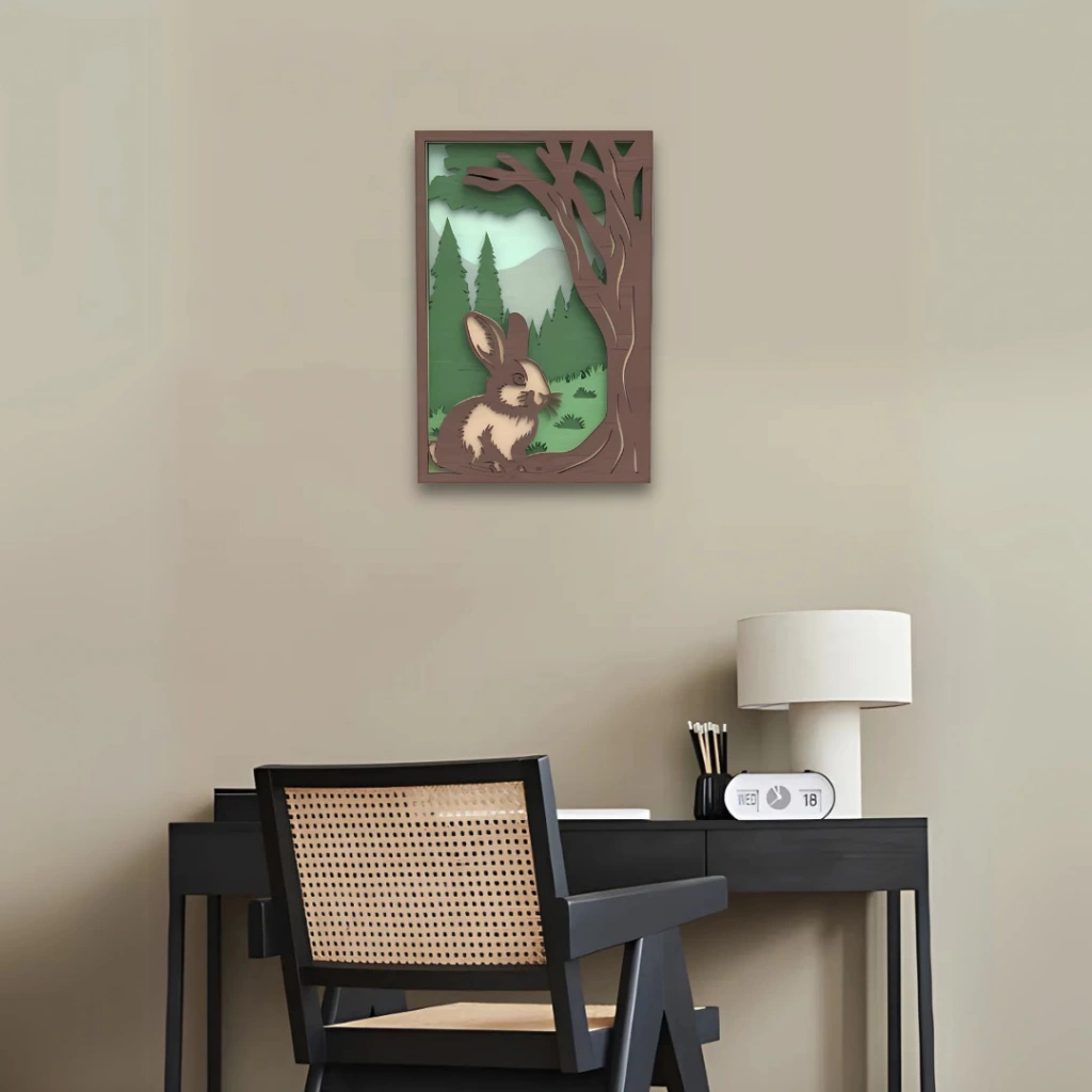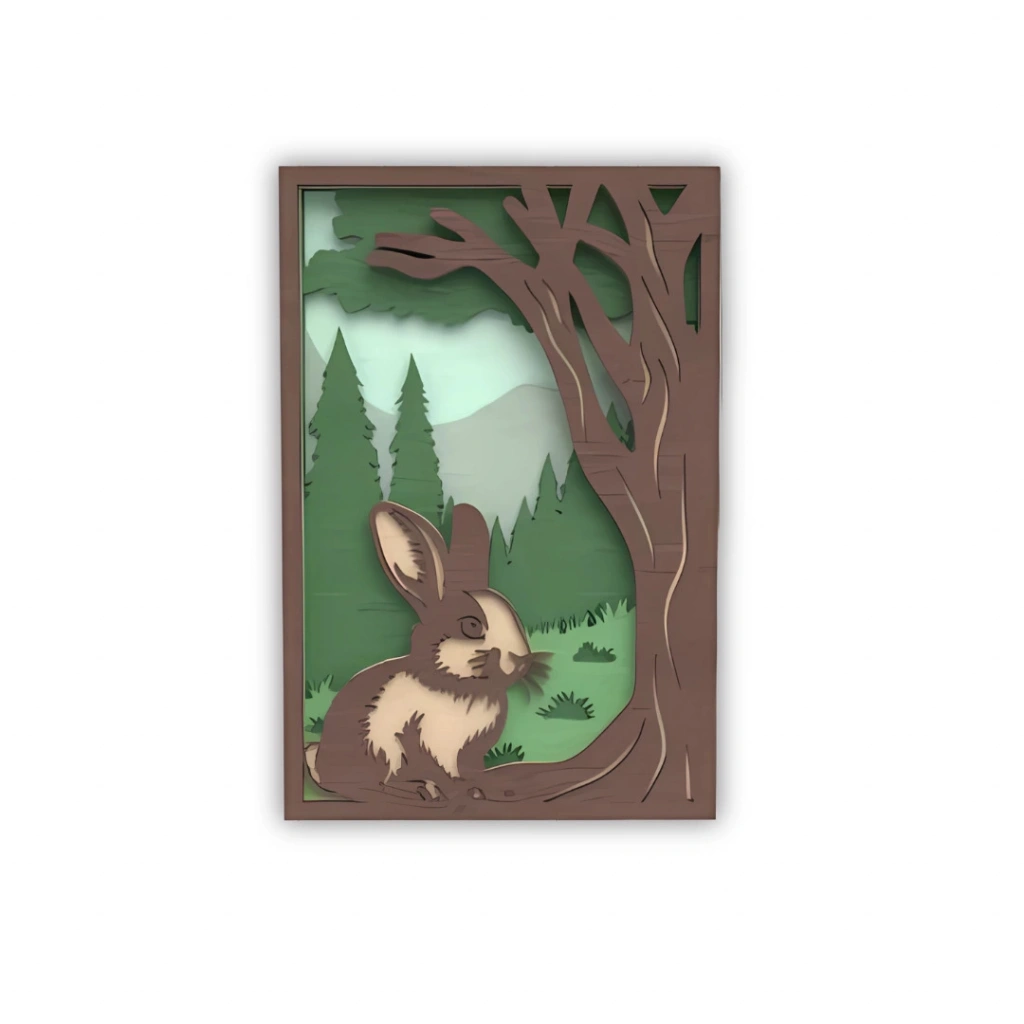 Orman derinliklerinde sakince duran bir tavşanı konu alan bu zarif ahşap tablo, doğayı evinize taşıyan sıcak ve huzurlu bir dekorasyon öğesi sunar. Çok katmanlı lazer kesim yapısı sayesinde derinlik hissi verirken pastel renk geçişleriyle duvarda yumuşak bir etki yaratır. Öne Çıkan Özellikler: